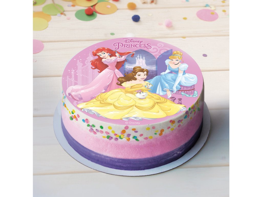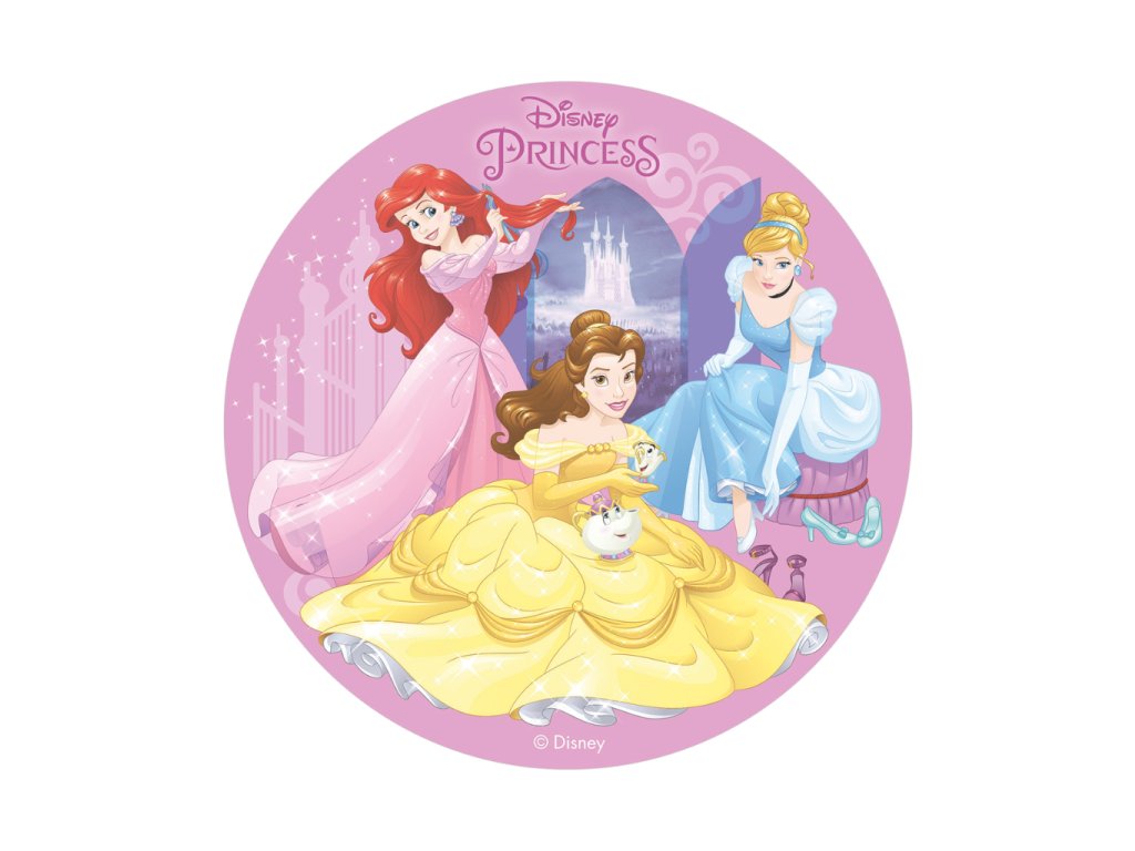 Jedlý papír s motivem princezen. Kulatý formát 20 cm, barevný tisk, určený k rychlému zdobení dortů a dezertů.