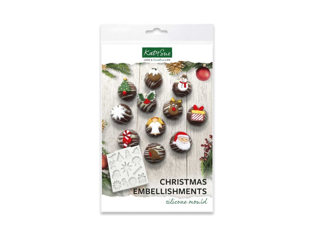 Detailní silikonová forma Katy Sue na vánoční motivy umožňuje snadno vytvořit drobné vánoční dekorace v profesionální kvalitě. Vhodná pro fondán, modelovací hmoty, čokoládu, izomalt i keramickou hmotu. Forma zachycuje jemné detaily a přináší rychlé, čisté a efektní výsledky při zdobení vánočních dortů a dezertů.