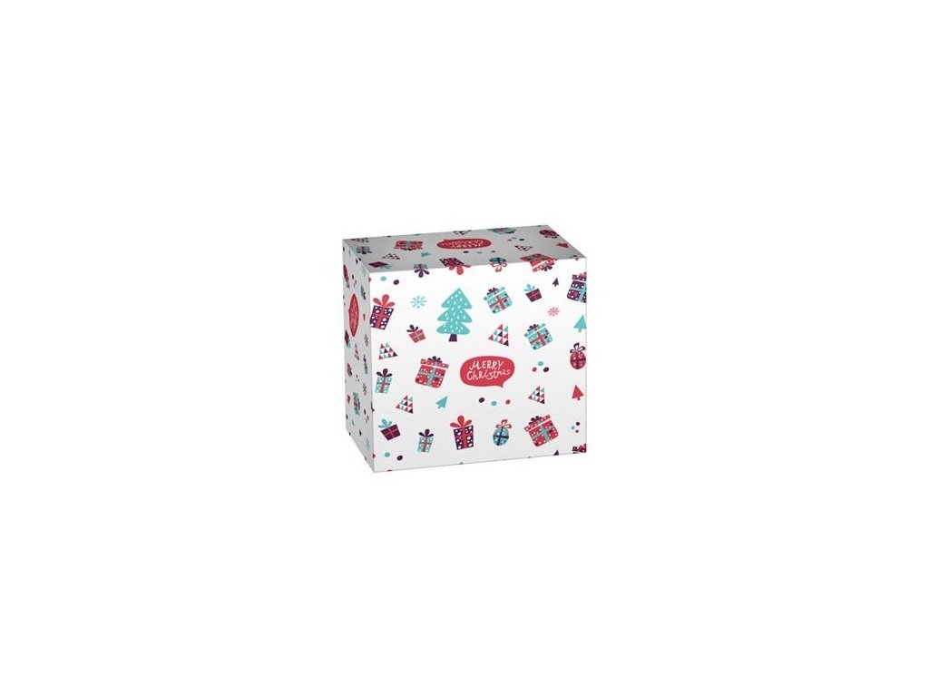 Rozměry 13 × 13 × 7 cm, papírová, lehce složitelná, vánoční motiv – dárečky, vhodná na cukroví nebo zákusky, balení 1 ks.