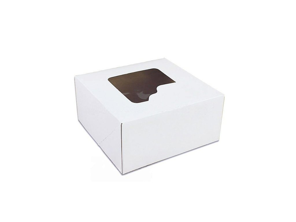 Rozměry 18 × 18 × 9 cm, papírová, skládací, bílá, s okýnkem, určená pro cukrářské výrobky, balení 1 ks.
