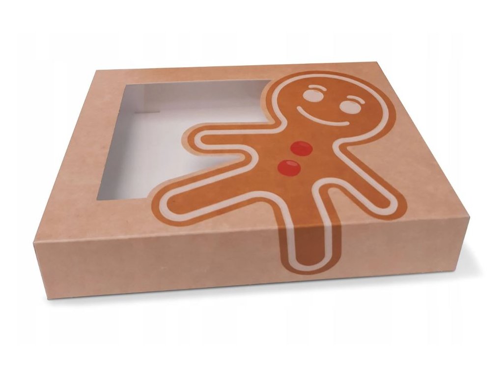 Rozměry 26 × 19 × 5 cm, papírová, lehce složitelná, s okýnkem, vánoční motiv – perníček, vhodná na cukroví nebo zákusky, balení 1 ks.