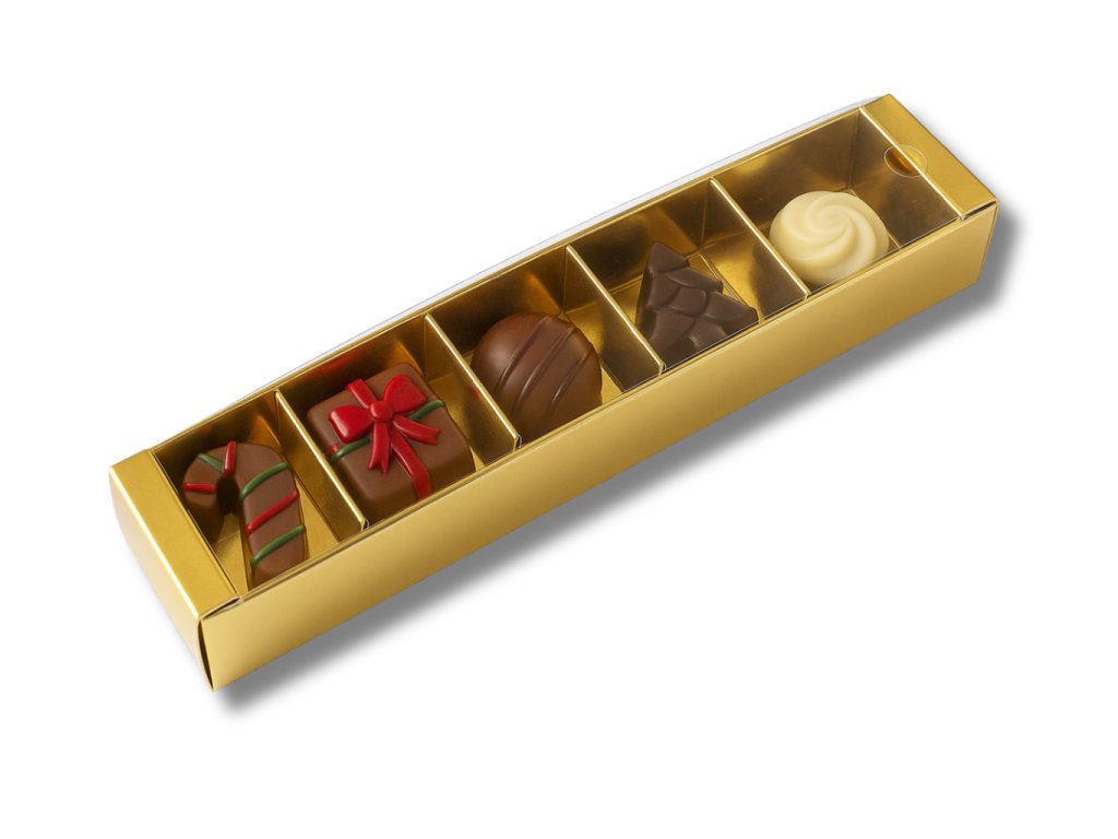 Zlatá krabička 21,5 × 5 × 3,5 cm na 5 pralinek. Karton se zlatou fólií, oddělovací vložka, plastové víčko. Ideální na pralinky a dárkové balení.