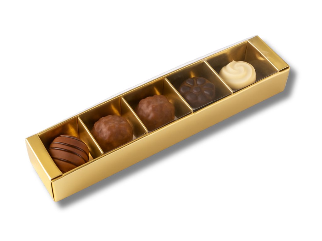 Elegantní dárková krabička na 5 pralinek o rozměrech 21,5 × 5 × 3,5 cm je ideální pro luxusní balení ručních pralinek, čokoládovách lanýžů či drobných dezertů. Vnitřní oddělovací vložka udržuje pralinky bezpečně oddělené a průhledné plastové víčko umožňuje krásnou prezentaci obsahu. Karton potažený zlatou fólií dodává krabičce výjimečný vzhled a činí z ní perfektní volbu pro cukrárny, dárková balení i domácí tvůrce sladkostí.