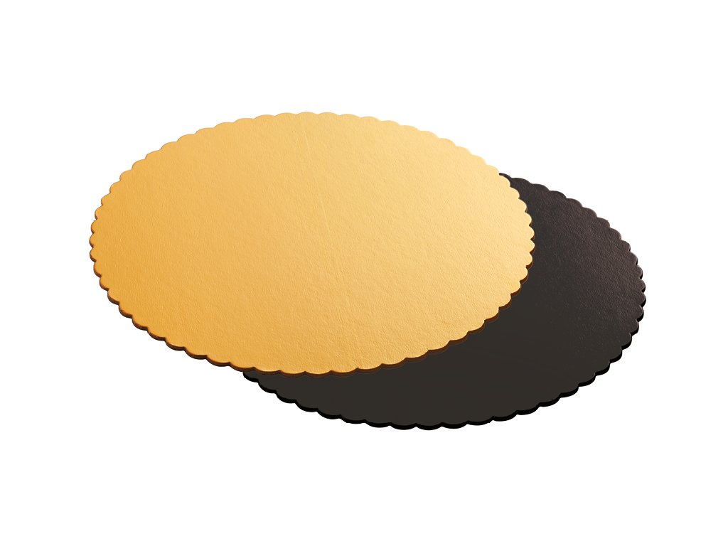Zlatočerná podložka pod dort O 22 cm, tloušťka 3 mm, oboustranná, zlatá a černá fólie, kartonová, nepromastitelná, vhodná pro dorty i zákusky.