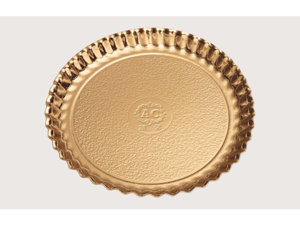 Kartonová podložka se zlatou folií na povrchu a vyvýšeným okrajem.