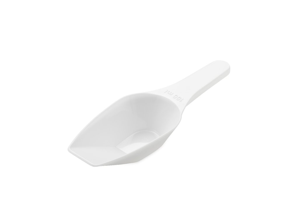 Objem 100 ml, délka 20 cm, materiál plast, barva bílá, odměrka vhodná pro sypké suroviny.
