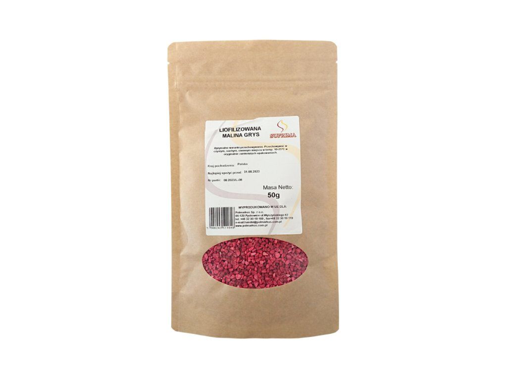 Mrazem sušené maliny, hmotnost balení 50 g, jemná drť, bez přidaného cukru, vhodné na zdobení dortů, koláčů či zmrzlin.