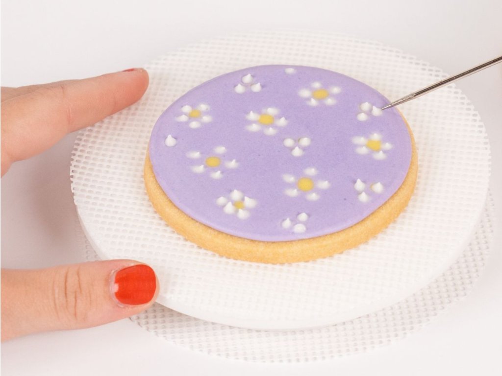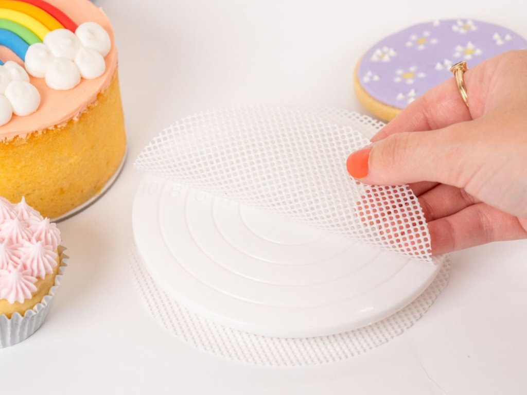 Mini otočný stojan na zdobení je praktická pomůcka pro dekorování sušenek, cupcaků a drobných dezertů. Součástí balení jsou 2 opakovaně použitelné protiskluzové silikonové podložky, které drží dezert na místě během zdobení.