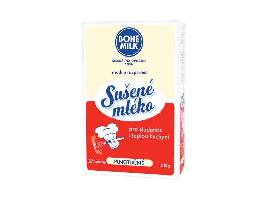 Množství 400 g, plnotučné, obsah tuku 26 %, snadno rozpustné, vhodné pro pečení, vaření, přípravu nápojů a cukrářské směsi.