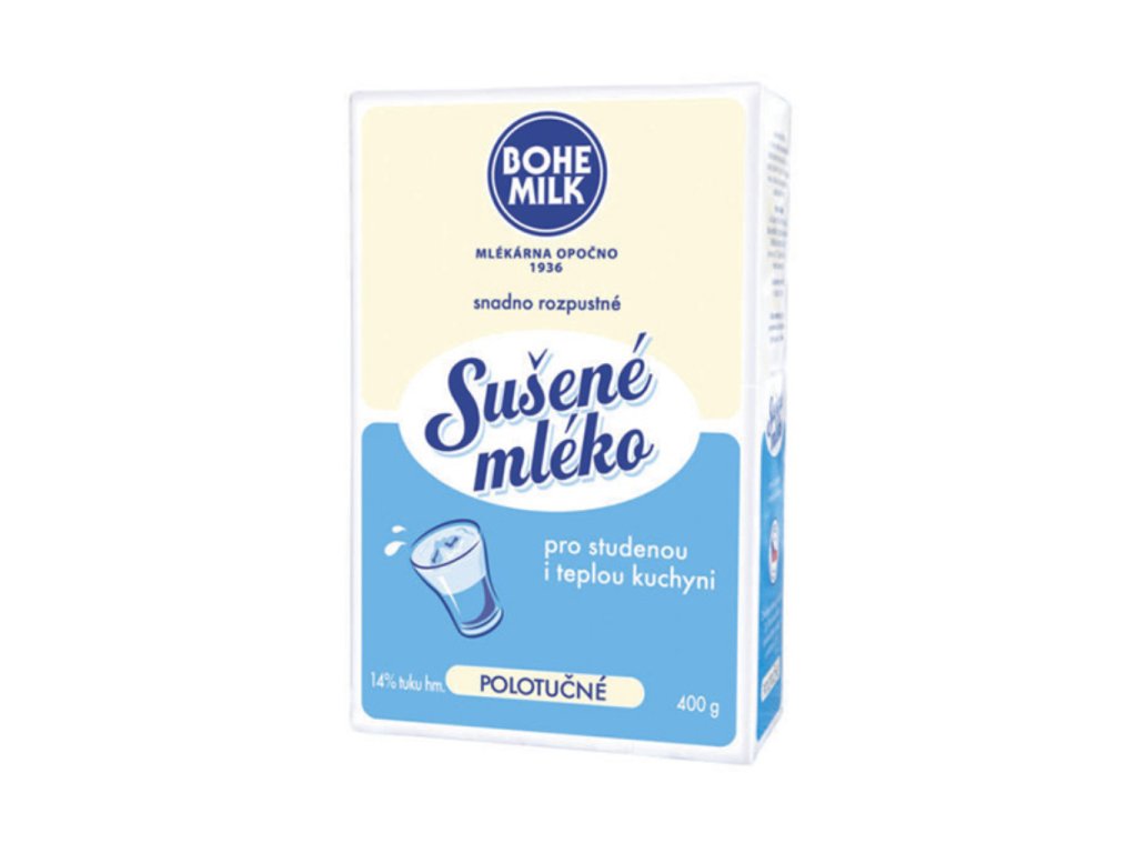 Bohemilk sušené polotučné mléko 400 g. Univerzální mléčný prášek z českého mléka, vhodný pro pečení, vaření, přípravu nápojů a cukrářské směsi.