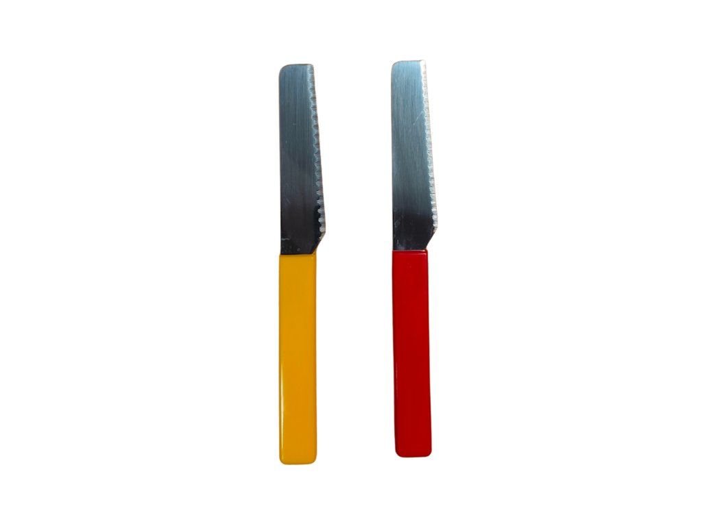 Nůž snídaňový na pečivo, vroubkovaná čepel, délka čepele 9 cm, celková délka 21 cm, plastová rukojeť ve žluté nebo červené barvě, kvalitní nerezová ocel.