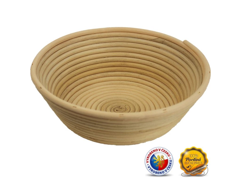 Vnitřní rozměry: vrch průměr 22,5 cm, dno průměr 14,5 cm, výška 7,5 cm, kapacita: 1 kg těsta, materiál: pedig, barva: přírodní.