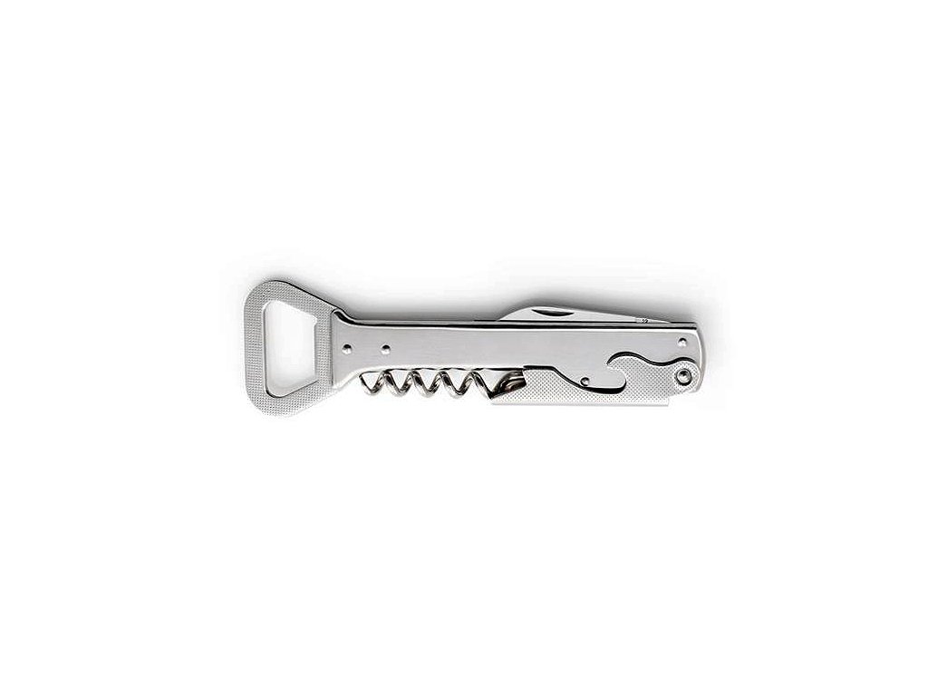 Kombinovaný číšnický otvírač z nerezové oceli vhodný k otevírání uzávěrů korunkových, korkových i uzávěrů PET lahví, s čepelí pro odstraňování fólií z vinných lahví.