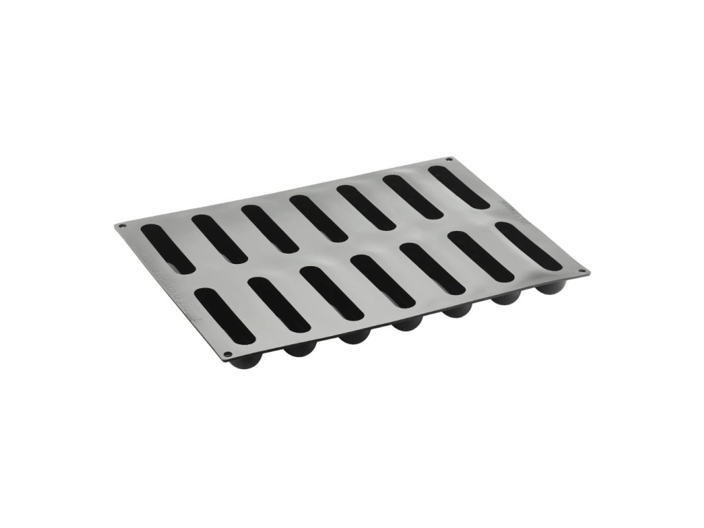 Rozměr formy 300 × 400 mm, 14 dutin, objem jedné dutiny 90 ml, rozměr dutiny 128 × 30 × 28 mm, profesionální platinový silikon, teplotní odolnost −40 °C až +250 °C, vhodná do trouby i mrazáku.