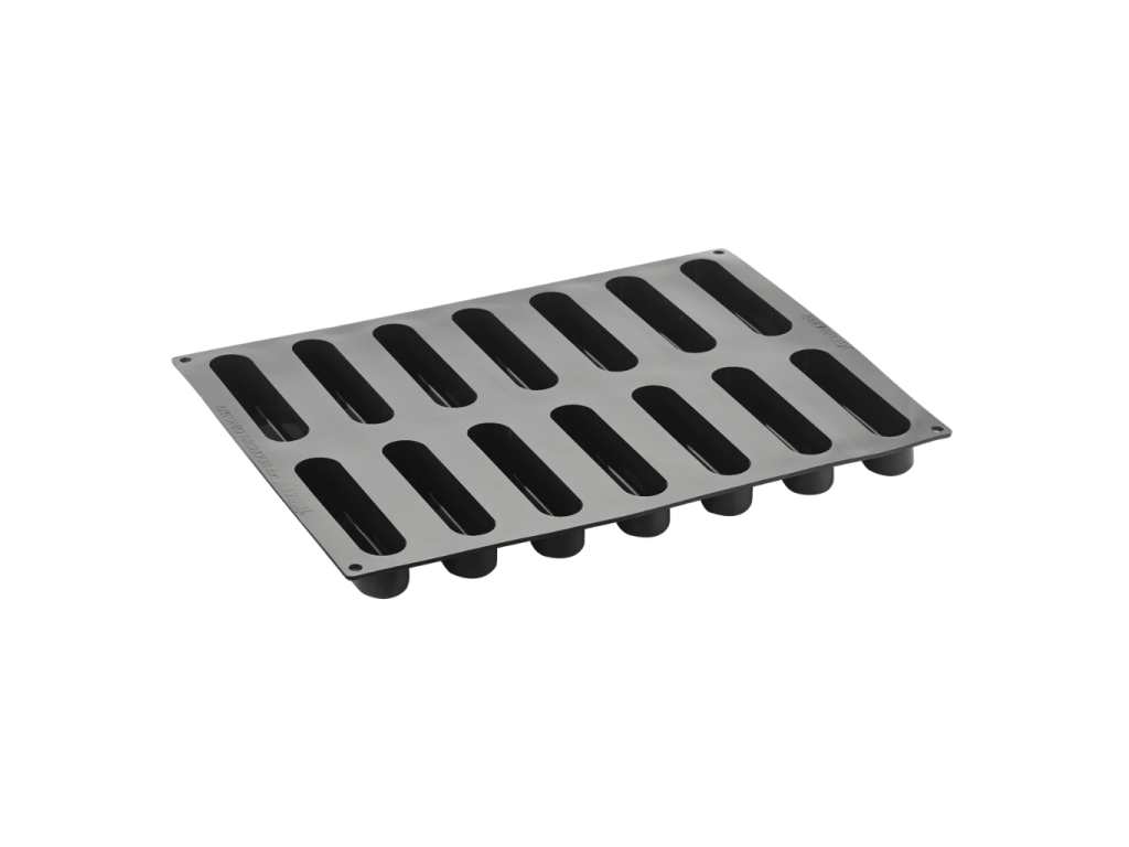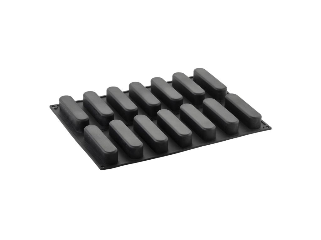 Rozměr formy 300 × 400 mm, 14 dutin, velikost dutiny 125 × 28 × 28 mm, objem 90 ml, materiál silikon, vhodná do trouby, mrazáku i myčky na nádobí.