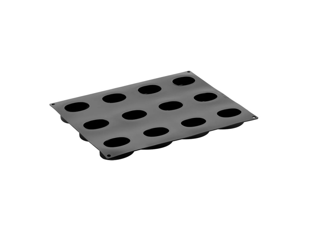 Rozměr formy 300 × 400 mm, 12 dutin, objem jedné dutiny 100 ml, profesionální platinový silikon, teplotní odolnost −40 °C až +250 °C, vhodná do trouby i mrazáku.