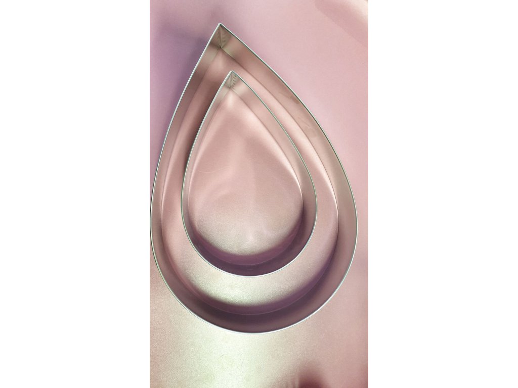 Rozměry: 38 × 25 cm, výška: 6 cm, tvar: kapka, materiál: pocínovaný plech, ruční výroba, určeno pro krátkodobý styk s potravinami, zejména na pečení.