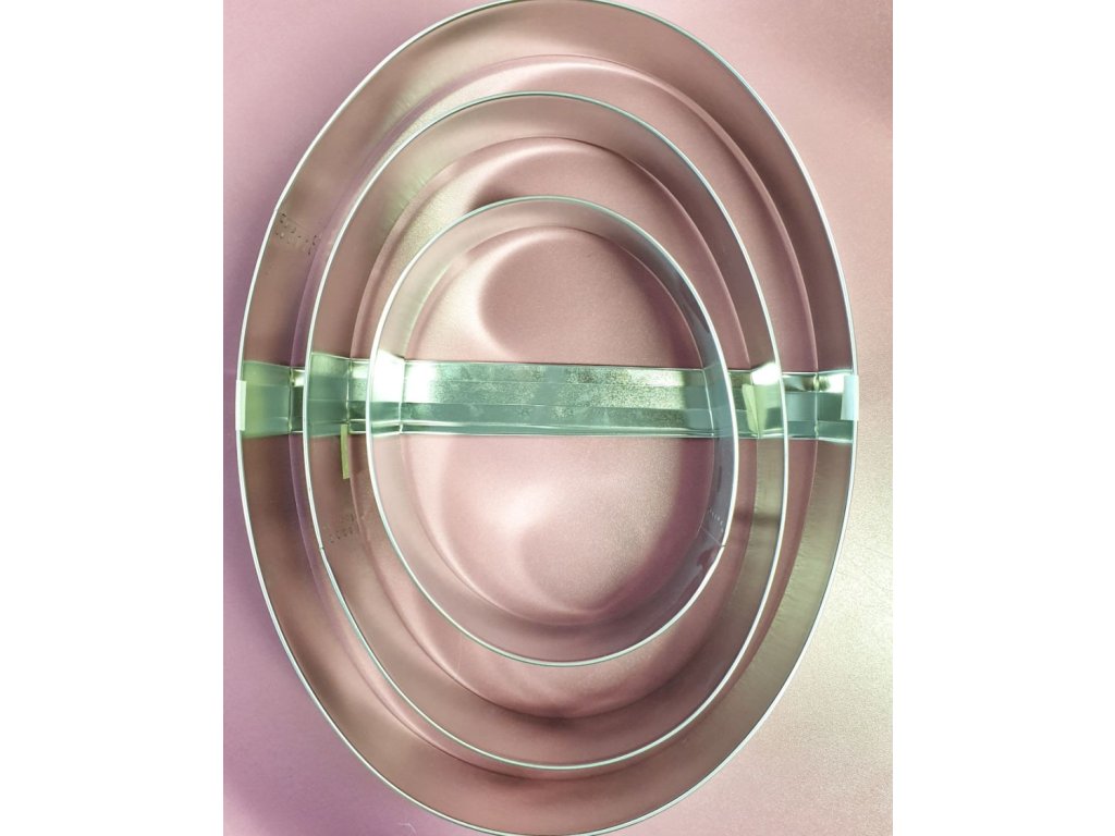Rozměry: 34 × 25 cm, výška: 6 cm, tvar: ovál, materiál: pocínovaný plech, ruční výroba, určeno pro krátkodobý styk s potravinami, zejména na pečení.