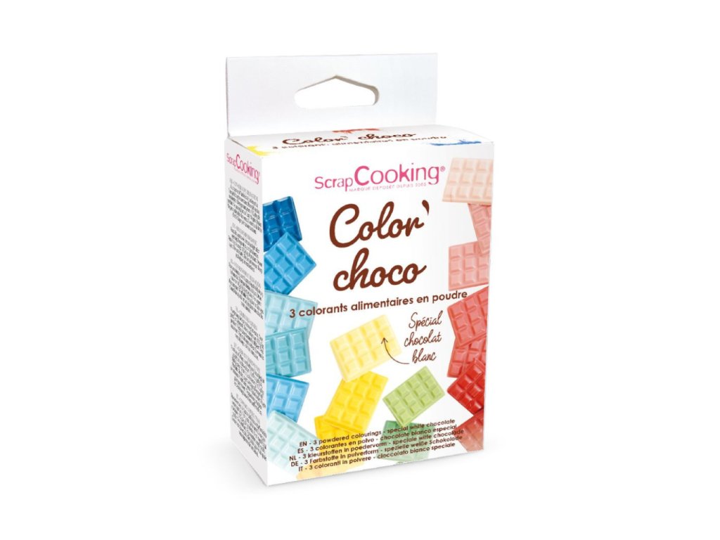 3 práškové barvy rozpustné v tucích – červená, modrá, žlutá; 3 × 5 g; na barvení bílé čokolády a tukových hmot; dávkování max. 0,4 g/kg; balení 1 sada.