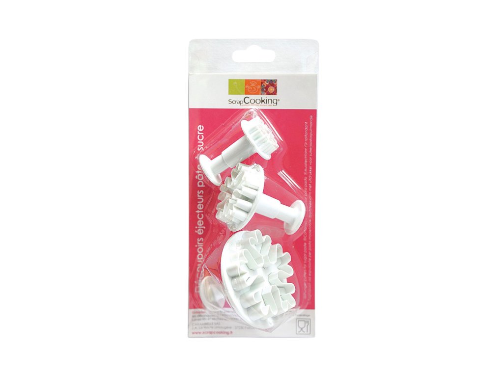 Tvar sněhová vločka, množství 3 ks, průměry 6,5 cm / 4,5 cm / 3 cm, materiál potravinářský plast, snadné vytlačování, vhodné na těsto, fondán a marcipán.