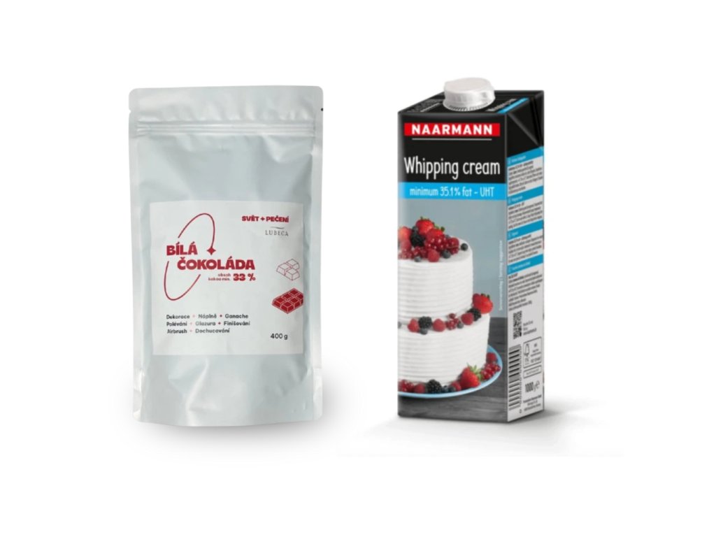 Set obsahuje bílou čokoládu Lubeca 400 g, 33 % a Smetanu ke šlehání UHT 1 litr 35%