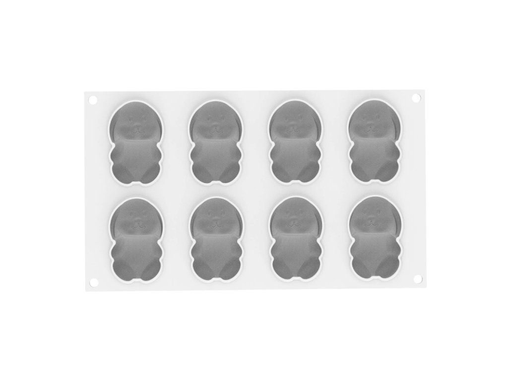 Silikonová forma, tvar králíček, 8 dutin, objem jedné dutiny 70 ml, rozměr jedné dutiny 76 × 50 × 29 mm, potravinářský silikon, teplotní odolnost −60 °C až +230 °C, vhodná do trouby, mrazáku, mikrovlnné trouby i myčky nádobí, ideální pro mousse, čokoládu i marshmallow dezerty, bez BPA a PFAS, součástí balení i plastové vykrajovátko.