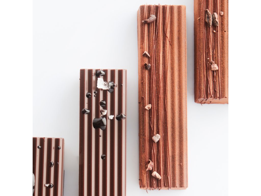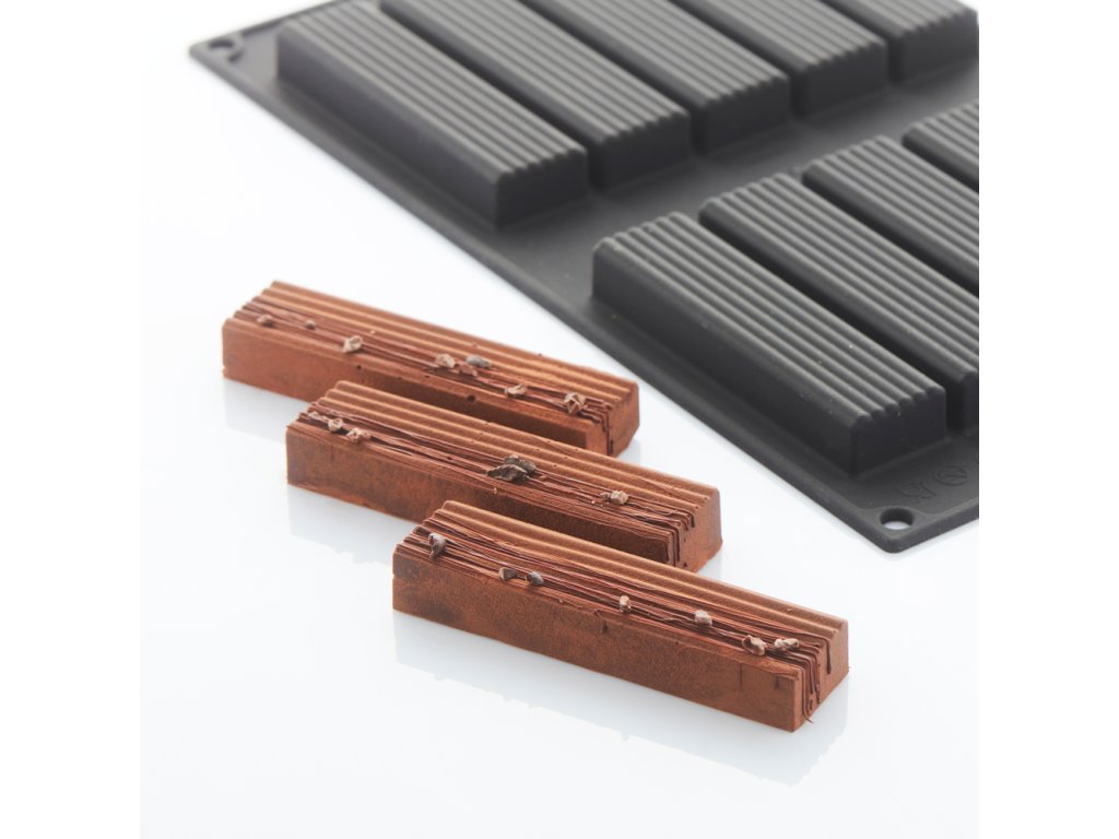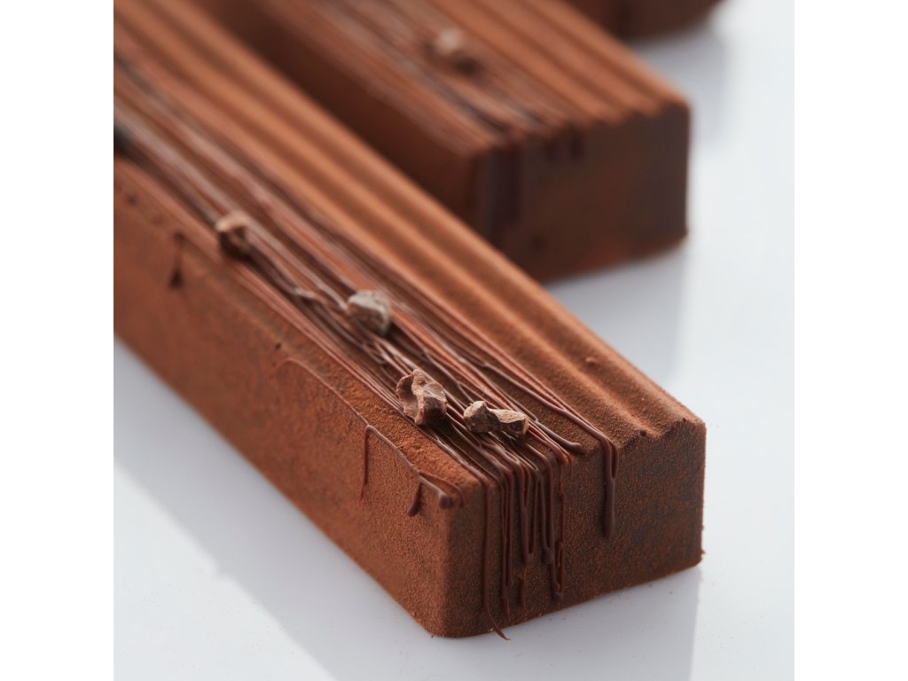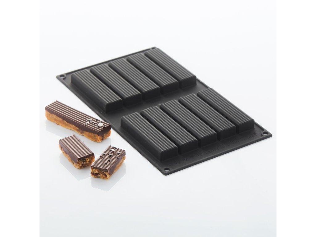 Profesionální forma Wiggle z kolekce BlackSil vznikla ve spolupráci s Albertem Simionatem (Chocolate Academy Milano). Deset formiček o rozměrech 99,5 × 25,5 × 15,5 mm pojme 37 ml a vytvoří nízký “proužek” s jemným zvlněním – ideální pro stylové dezerty, snack-cakes či komponenty degustačních menu.