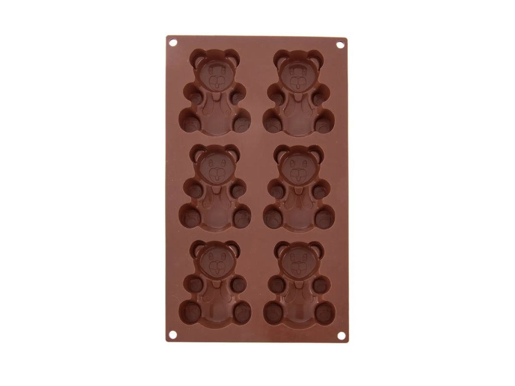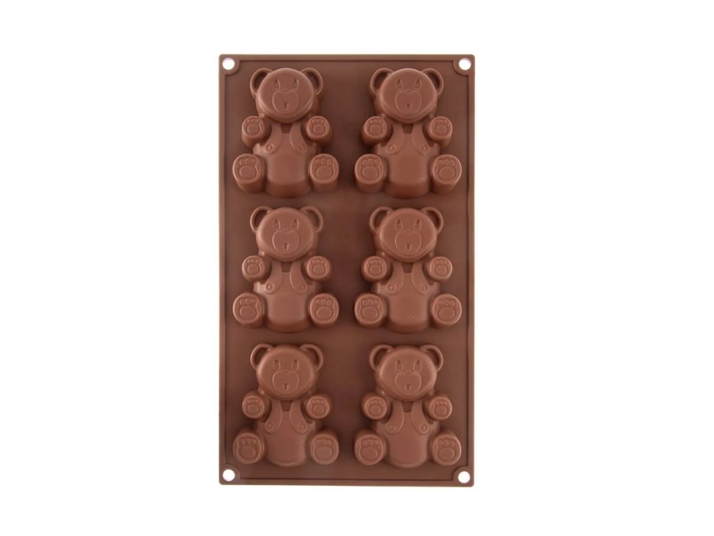 Silikonová nepřilnavá forma na pečení ve tvaru medvídků, 6 tvarů v jedné formě, hnědá barva, rozměr 30,3 × 17,8 × 2 cm. Vhodná na pečení i mražení.
