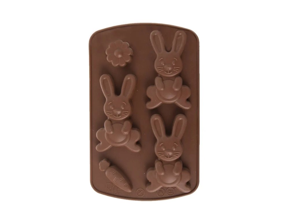 Pět silikonových formiček ve tvaru zajíčků, mrkve a kytičky, hnědá barva, rozměr 21 × 13,5 × 1,5 cm. Vhodná na sušenky i čokoládu.