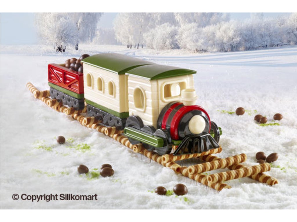 Silikonová forma – sada s motivem vláčku. Vícedílné provedení, detailní reliéf, pružný potravinářský silikon. Vhodná pro pečení i studené dezerty.