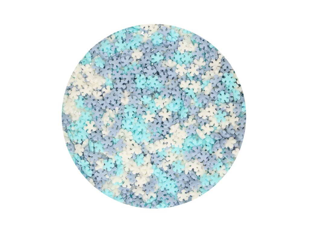 Cukrové sypání, balení 50 g, směs malých sněhových vloček v bílých a modrých odstínech, ideální pro dekorování vánočních dortů, cupcaků a sušenek.