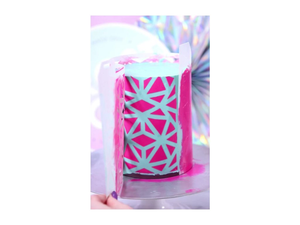 - Zvedněte formu kolem dortu jako obvykle. Přitlačte šablonu k lineru a upevněte ji klipy, aby vzor zůstal přesně tam, kde má být.