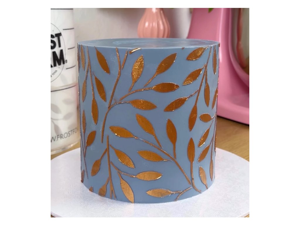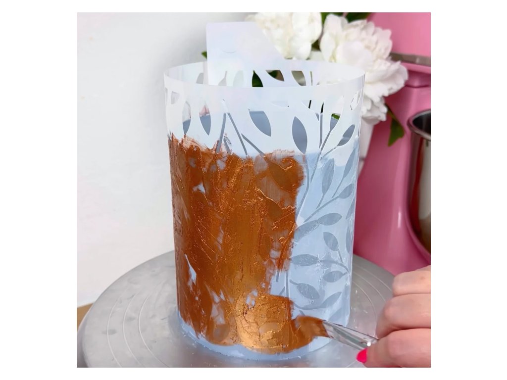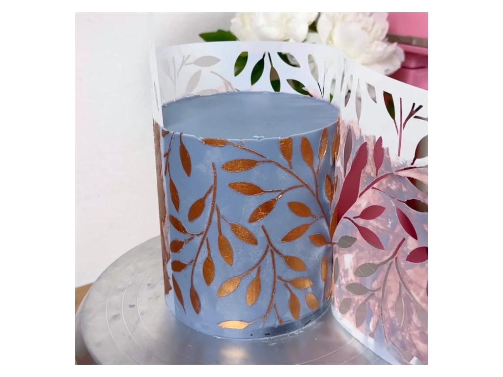 Šablonu můžete použít i klasickým způsobem – ručně přiložit na bok dortu a natřít krémem nebo ganachem. Výsledky jsou krásné, ale s Frost Form systémem získáte naprostou přesnost bez zdlouhavého lepení a opravování.