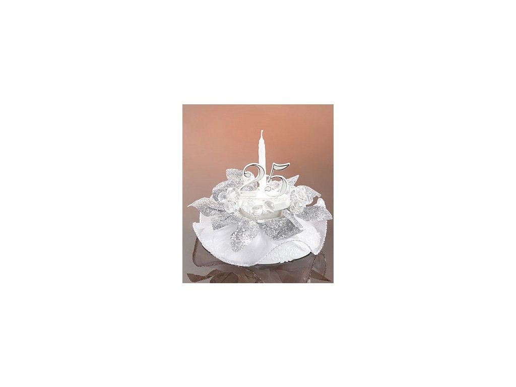 Průměr: cca 8,5 cm, výška: cca 9,5 cm, materiál: vosk, plast, tyl, barva: bílá, stříbrná, vhodná na dort i jako dekorace na stůl, obsah balení 1 ks.