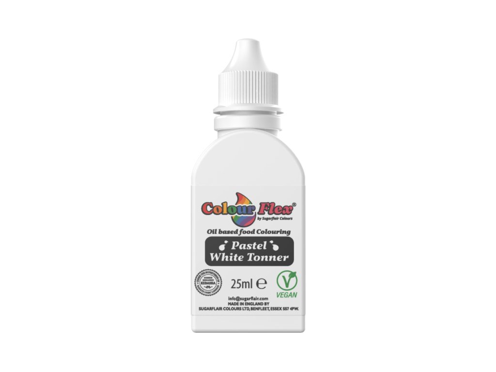 Sugarflair bílý toner je vysoce koncentrovaná gelová barva na bázi oleje, která je speciálně vyvinutá pro receptury s vyšším obsahem tuku. Skvěle funguje v máslových krémech, švýcarském meringue, ganache, čokoládě i fondánu, kde vytváří rovnoměrný a čistě bílý tón.