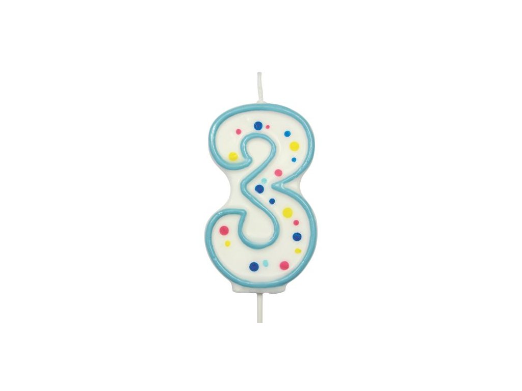 Výška: 6,3 cm, tvar: číslice 3, barva: bílá s modrým lemem a barevnými puntíky, materiál: vosk, obsah balení 1 ks, ideální pro zdobení dortů k narozeninám.