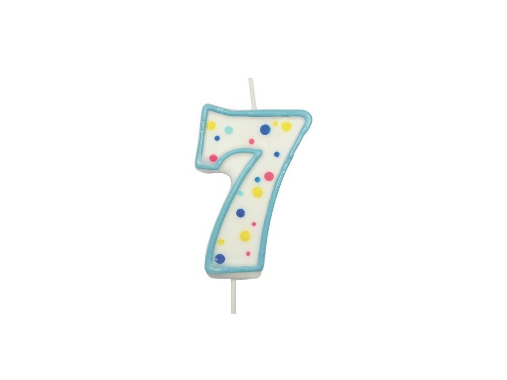 Výška: 6,3 cm, tvar: číslice 7, barva: bílá s modrým lemem a barevnými puntíky, materiál: vosk, obsah balení 1 ks, ideální pro zdobení dortů k narozeninám.