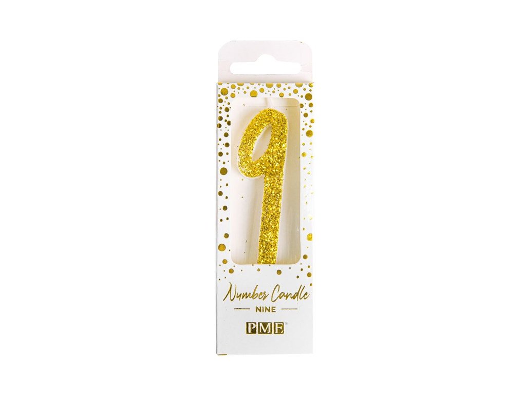 Výška: 8 cm, tvar: číslice 9, barva: třpytivá zlatá, materiál: parafínový vosk, obsah balení 1 ks, ideální pro zdobení dortů k narozeninám.