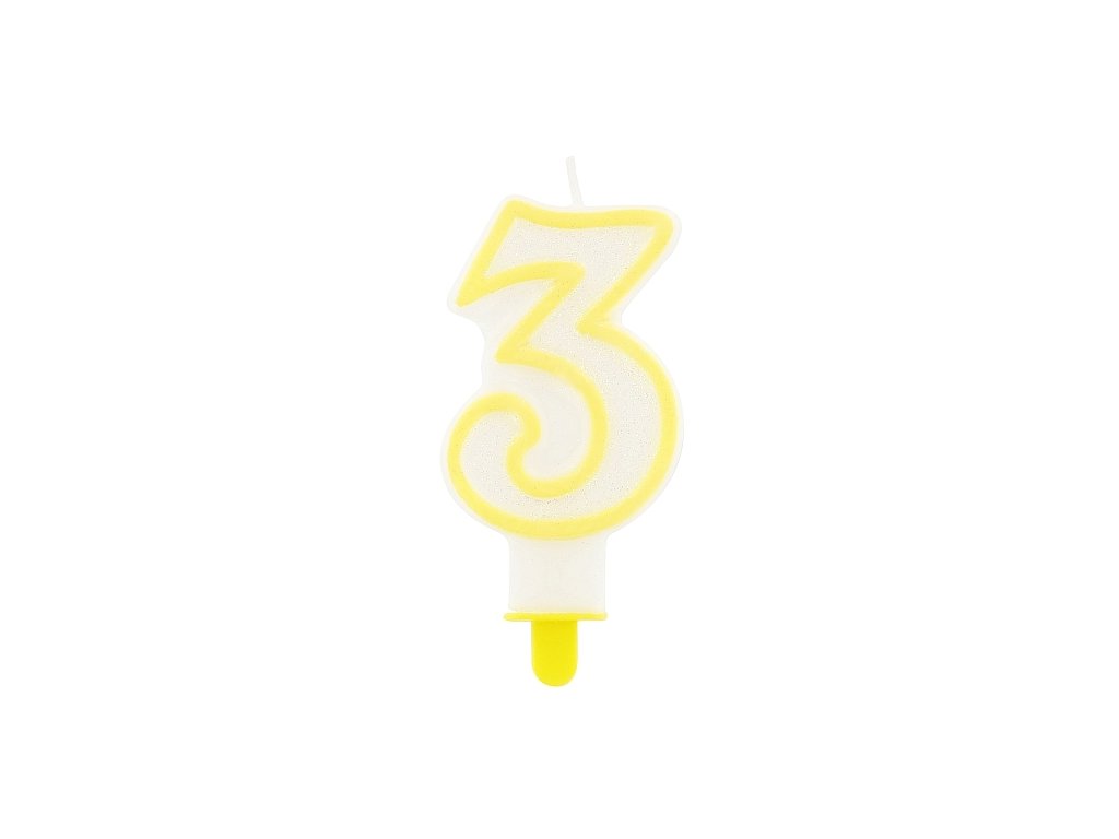 Výška: 8,5 cm, tvar: číslice 3, barva: třpytivá bílá se žlutým lemem, obsah balení 1 ks, ideální pro zdobení dortů k narozeninám.