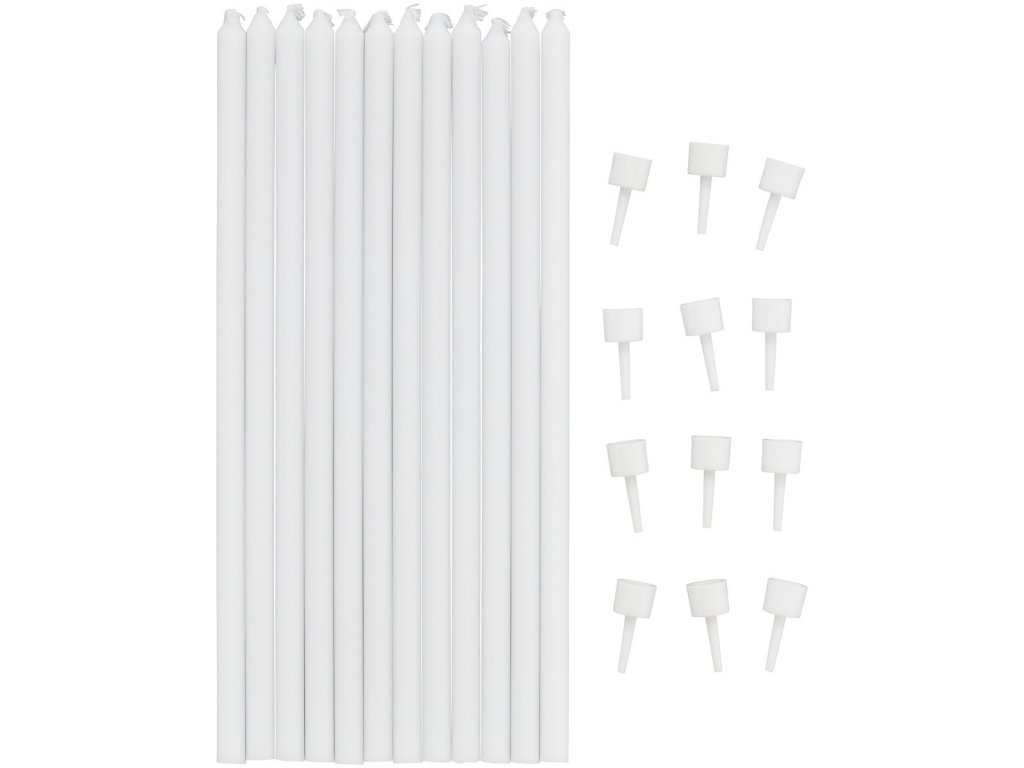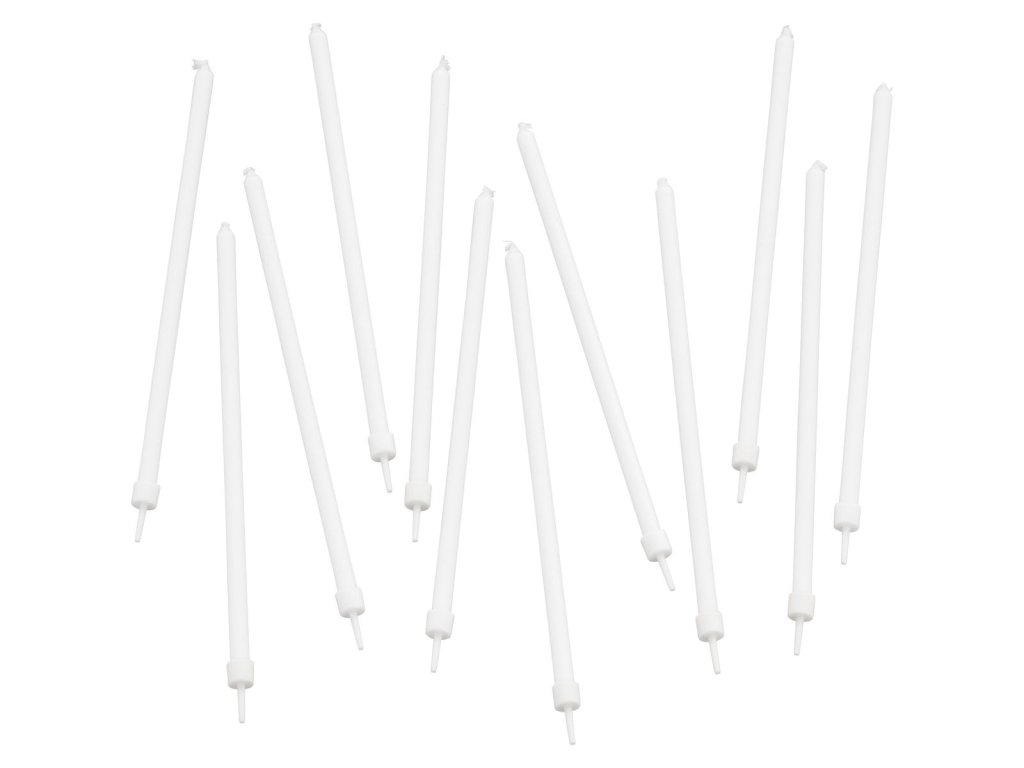 Výška: cca 15 cm, obsah balení: 12 svíček + 12 plastových držáků, barva: bílá, materiál: vosk, ideální pro zdobení dortů k narozeninám.