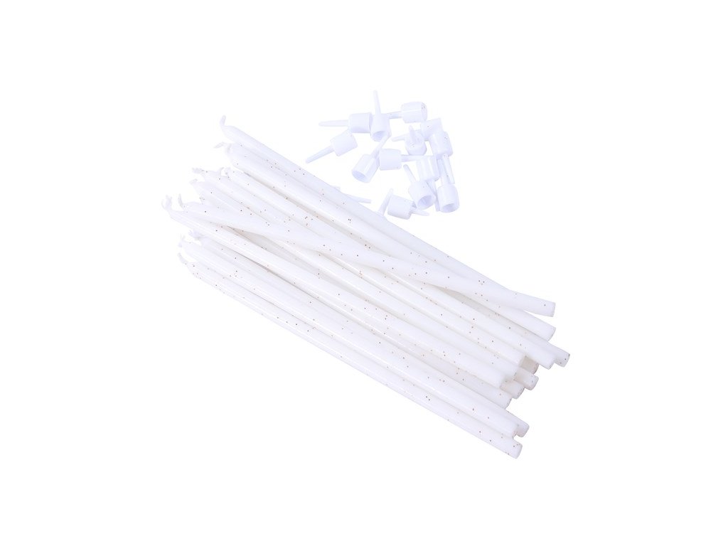 Výška: 18 cm, barva: bílá se třpytkami, obsah balení: 16 ks svíček + držáky na svíčky, ideální pro zdobení dortů k narozeninám.