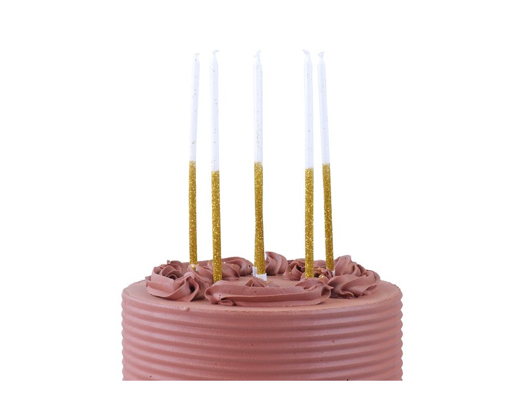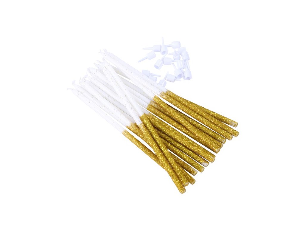 Výška: 18 cm, barva: bílo-zlatá, obsah balení: 16 ks svíček + držáky na svíčky, ideální pro zdobení dortů k narozeninám.