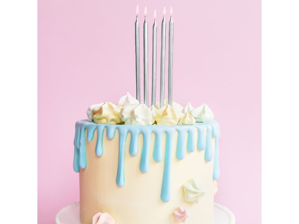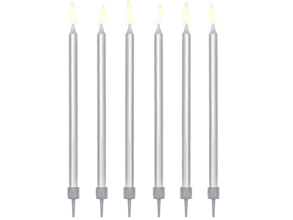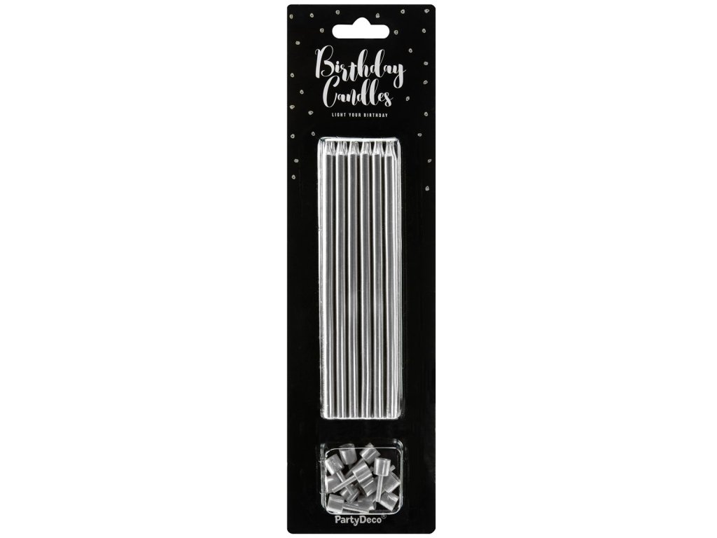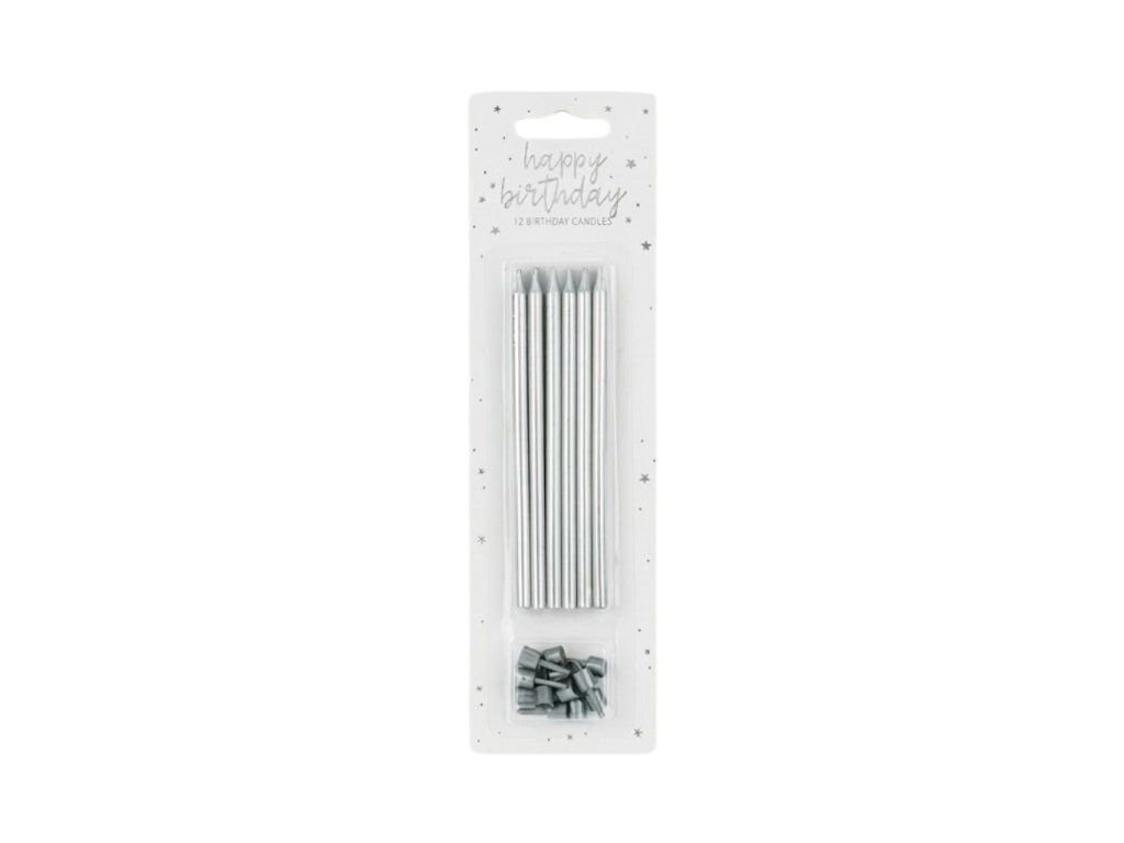 Výška: cca 12,5 cm, obsah balení: 12 svíček + 12 plastových držáků, barva: stříbrná, materiál: parafín, ideální pro zdobení dortů k narozeninám.
