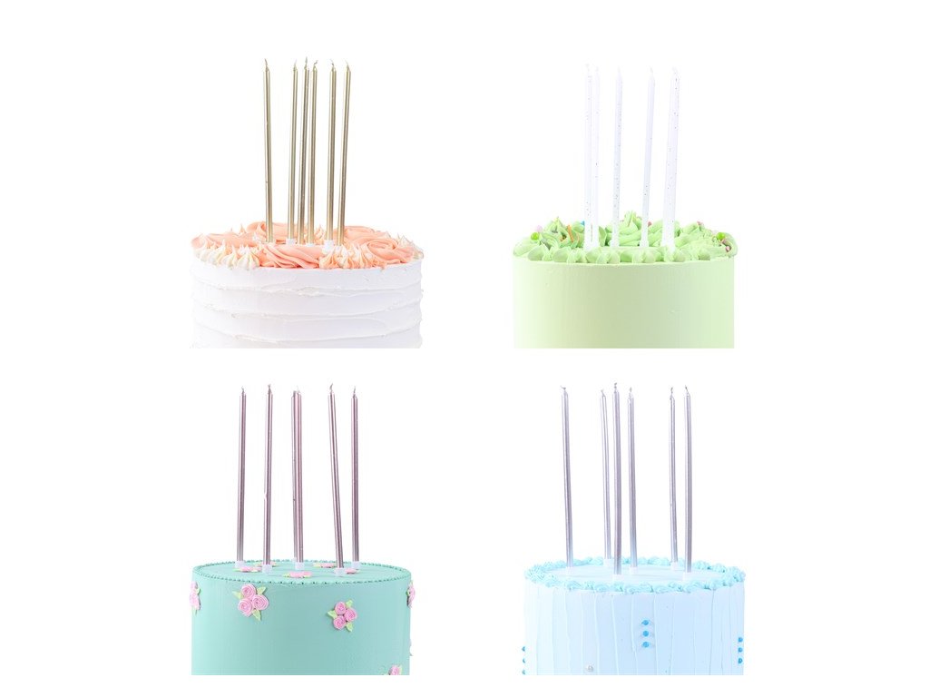 Výška: 18 cm, barva: zlatá, stříbrná, rose gold, bílá se třpytkami, obsah balení: 16 ks svíček + držáky na svíčky, ideální pro zdobení dortů k narozeninám.