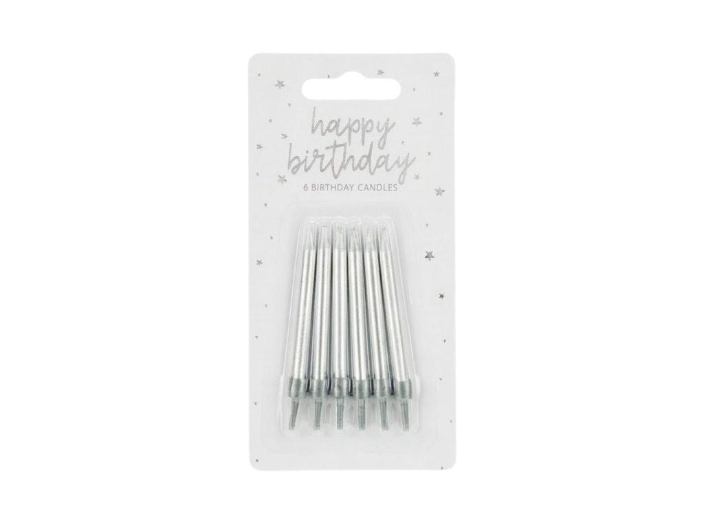 Výška: cca 6 cm, obsah balení: 6 svíček + 6 plastových držáků, barva: stříbrná, materiál: parafín, ideální pro zdobení dortů a cupcaků k narozeninám.