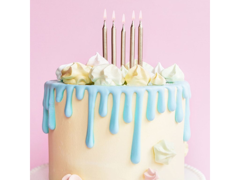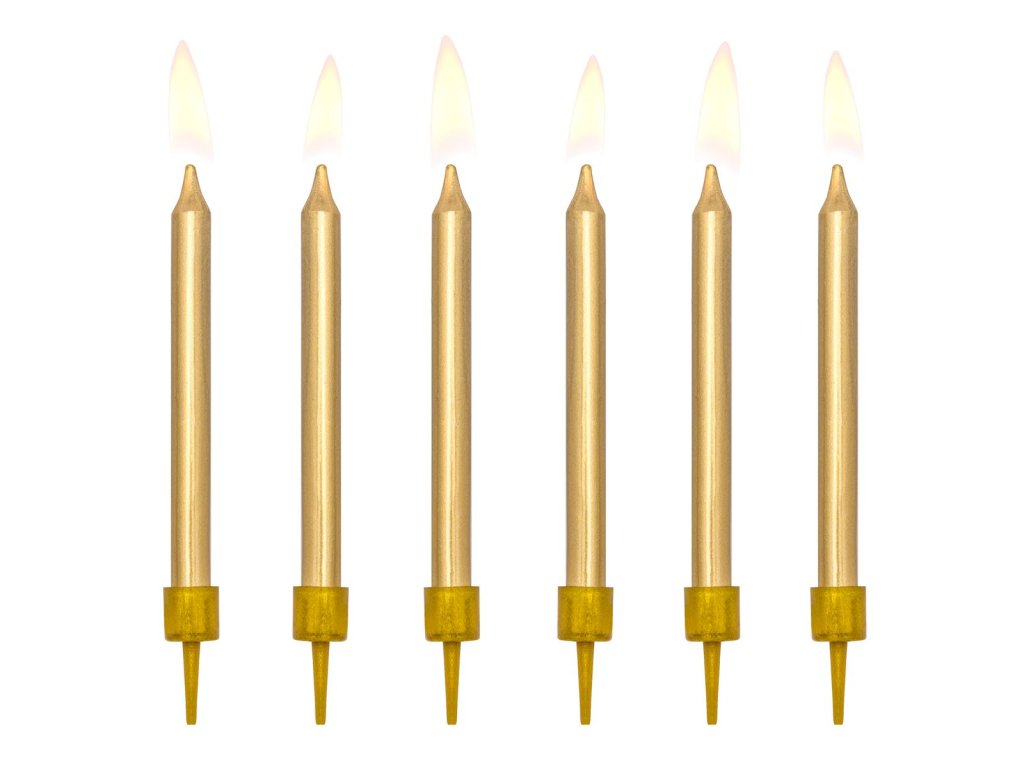 Výška: cca 6 cm, obsah balení: 6 svíček + 6 plastových držáků, barva: zlatá, materiál: parafín, ideální pro zdobení dortů a cupcaků k narozeninám.