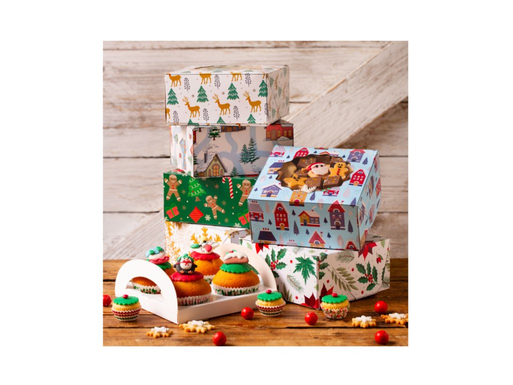 Elegantní vánoční krabice na cukroví s motivem sněhových vloček je vyrobena z pevného potravinářského kartonu. Skládací konstrukce umožňuje snadné sestavení bez lepidla a vložka zajistí bezpečné umístění až čtyř cupcaků. Perfektní volba pro balení domácích sladkostí, cukroví, sušenek nebo dárků.