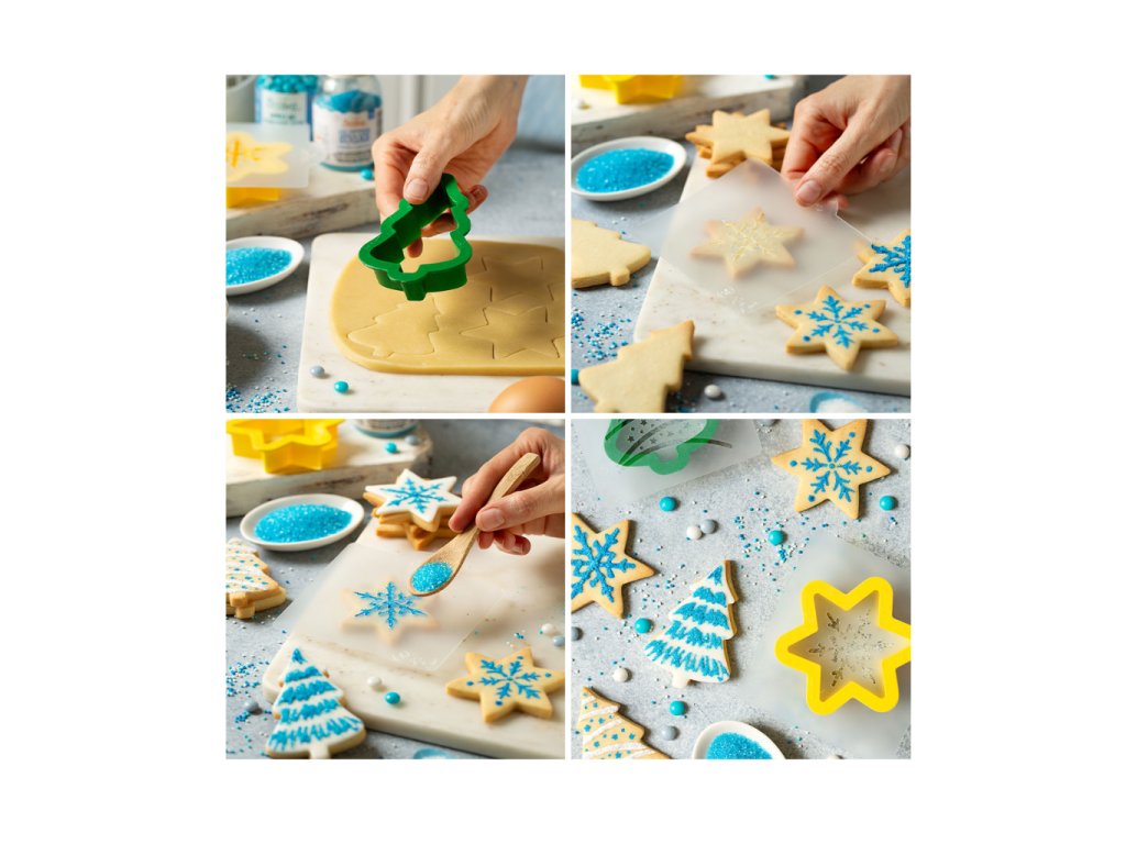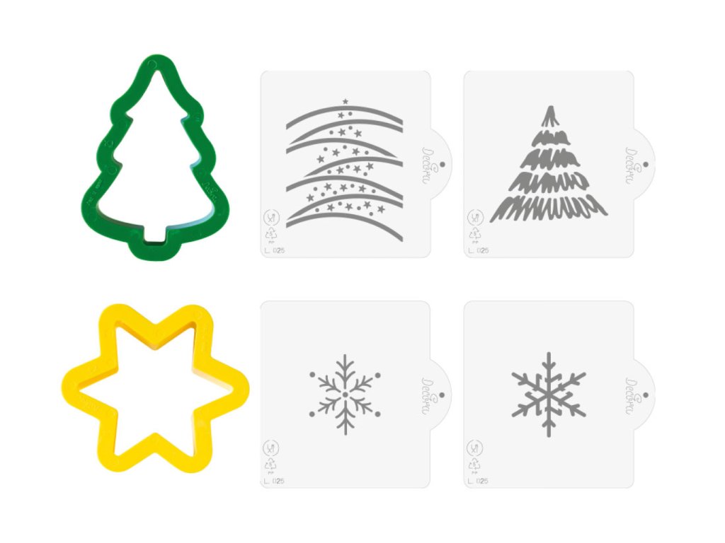 Sada 2 plastových vykrajovátek (stromek 8 cm, hvězda 7 cm) a 4 šablon pro zdobení. Ideální na cukroví, fondán i krémové dekorace.