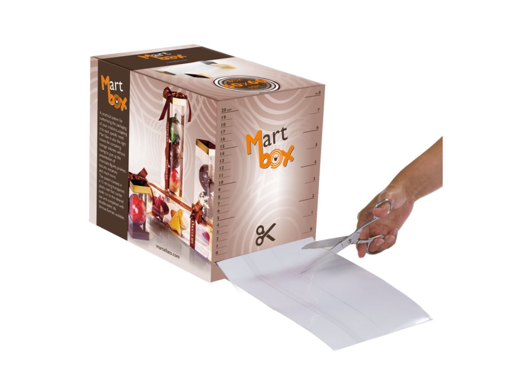Průhledná plastová fólie v roli je praktickým řešením pro profesionální balení cukrářských dezertů a monoporcí. Fólie je navinuta v pevné kartonové krabici s integrovaným výstupním otvorem a měřítkem, které umožňuje přesné zkrácení na požadovanou délku. Díky této flexibilitě lze fólii snadno přizpůsobit konkrétnímu výrobku a následně doplnit oboustrannými víky pro vytvoření stabilního a reprezentativního balení.