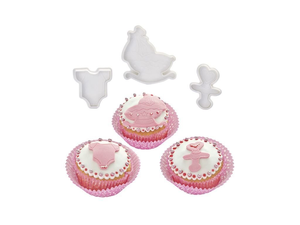 Sada 3 profi vykrajovátek s vypichovačem – motivy body, dudlík a kolébka, rozměry 40 / 45 / 70 mm, potravinářský plast, ruční mytí doporučeno (možno i myčka), vhodné pro fondán, marcipán a modelovací hmoty, nevhodné pro sušenková těsta, 1 sada.
